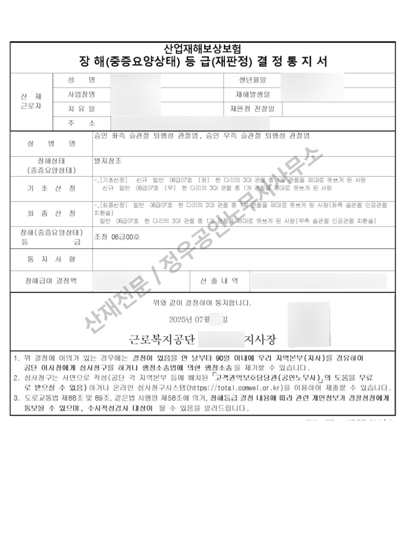 재해자분께서는 건설현장에서 철골공, 용접공 이력이 있으셨던 분으로 근무 중 무릎에 심한 통증을 느껴서 병원을 내원하셨고, 양측 관절염으로 인한 무릎 인공관절 치환수술을 받으셨습니다.